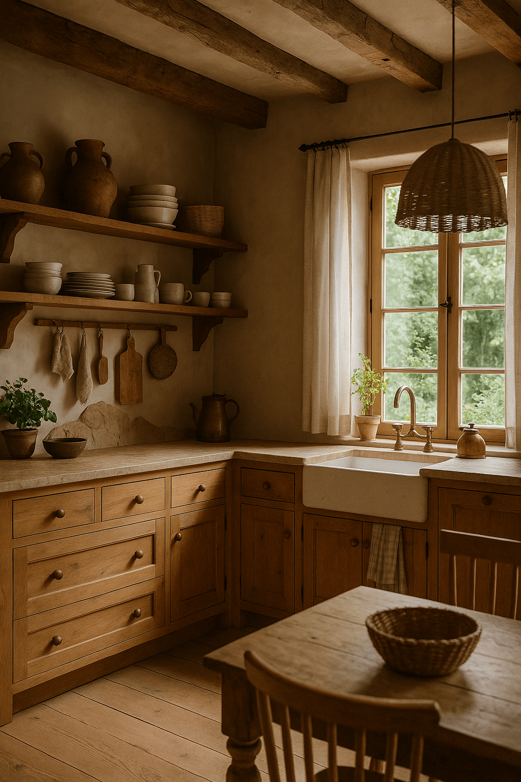 Köy ve yazlık ev mutfaklarında doğallığı öne çıkarmak önemlidir. Ahşap tezgâhlar, taş duvar kaplamaları ve seramik zeminler hem rustik bir görünüm kazandırır hem de mekânın doğa ile uyumunu artırır. Masif ahşap dolaplar ve açık raflar, mutfakta sıcak bir atmosfer yaratır.